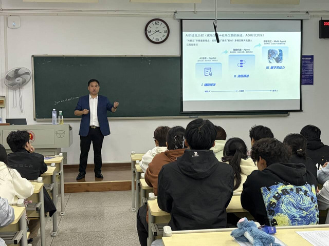 本网讯(通讯员:蔡津,审核:陶鹏)10月19日晚,2008届校友、信管实验2541班荣誉班主任、武汉航点科技有限公司创始人兼CEO胡星火,应邀来我院作“AI大模型在产业中的应用对本科人才培养的启示”主题讲座。信管实验2541班主任靳延安老师、辅导员寇竞泽及信管实验2541班、信管2541班、数管2541班全体学生参加。