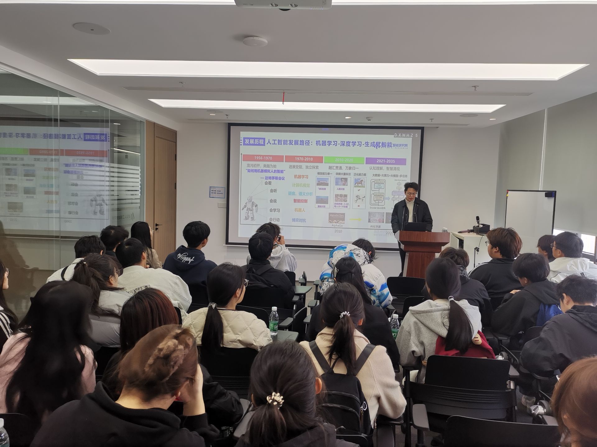 随后,研究院专家为师生作了题为“多模态大模型赋能千行百业”的专题讲座。讲座从人工智能发展历程切入,系统讲解了大模型的技术原理与演进脉络,并结合政务、医疗、制造、教育等行业案例,阐述了大模型如何推动产业智能化转型,实现与千百行业的深度融合与价值创造。在交流环节,同学们围绕大模型训练数据、应用门槛以及信管专业学生的能力准备等话题,与研究院专家进行了探讨与交流。
