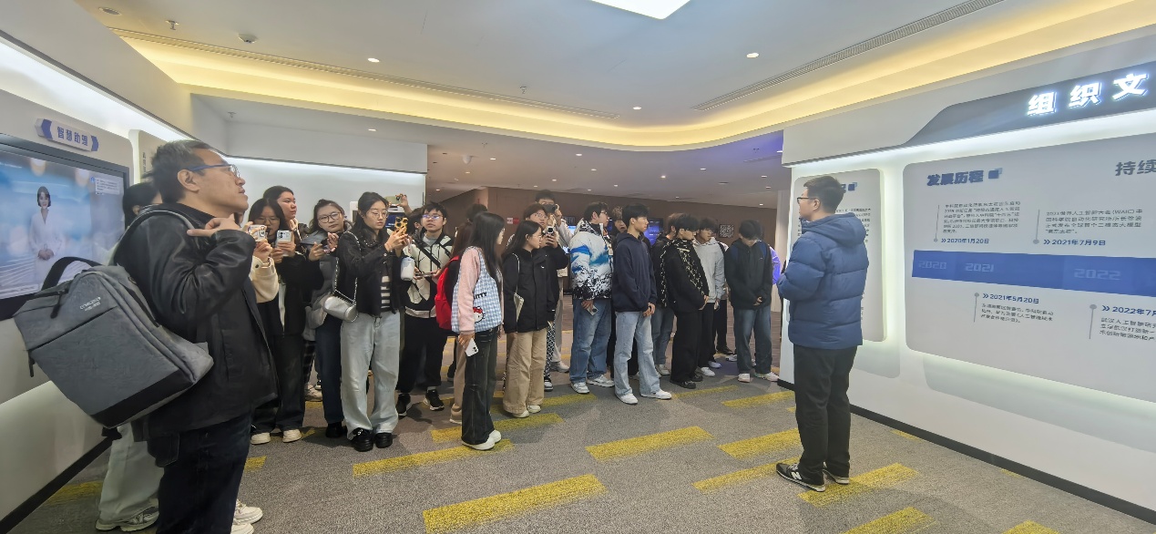 实习首站,同学们参观了研究院展厅,了解了其在人工智能领域的发展历程、科研成果与典型落地场景。在“紫东太初”多模态大模型展示区,同学们通过亲身体验,了解了该模型在图像、文本、语音、视频等多模态信息的统一理解与生成方面的先进能力,对大模型的技术特点与应用前景形成了直观认识。