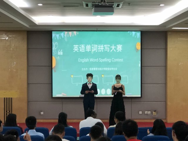 本网讯(通讯员 周沛琛 摄影 宣传部)2019年5月12日晚上7点,由信合学生会主办的单词拼写大赛于大学生活动中心第五报告厅如期举行,信息管理与统计学院副院长朱晓波老师、美国蒙哥马利奥本大学教授Francis Adepoju、信合17级班主任王东红老师、信合18级班主任刘杰老师及17、18级信合专业全体同学参与了本次活动。